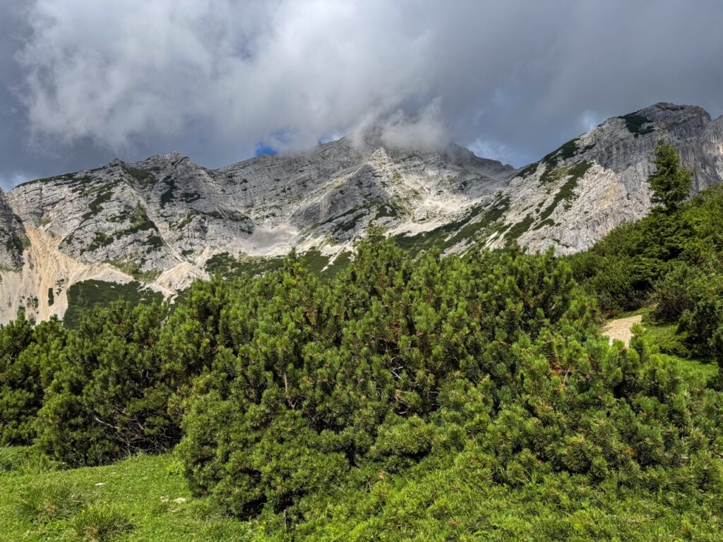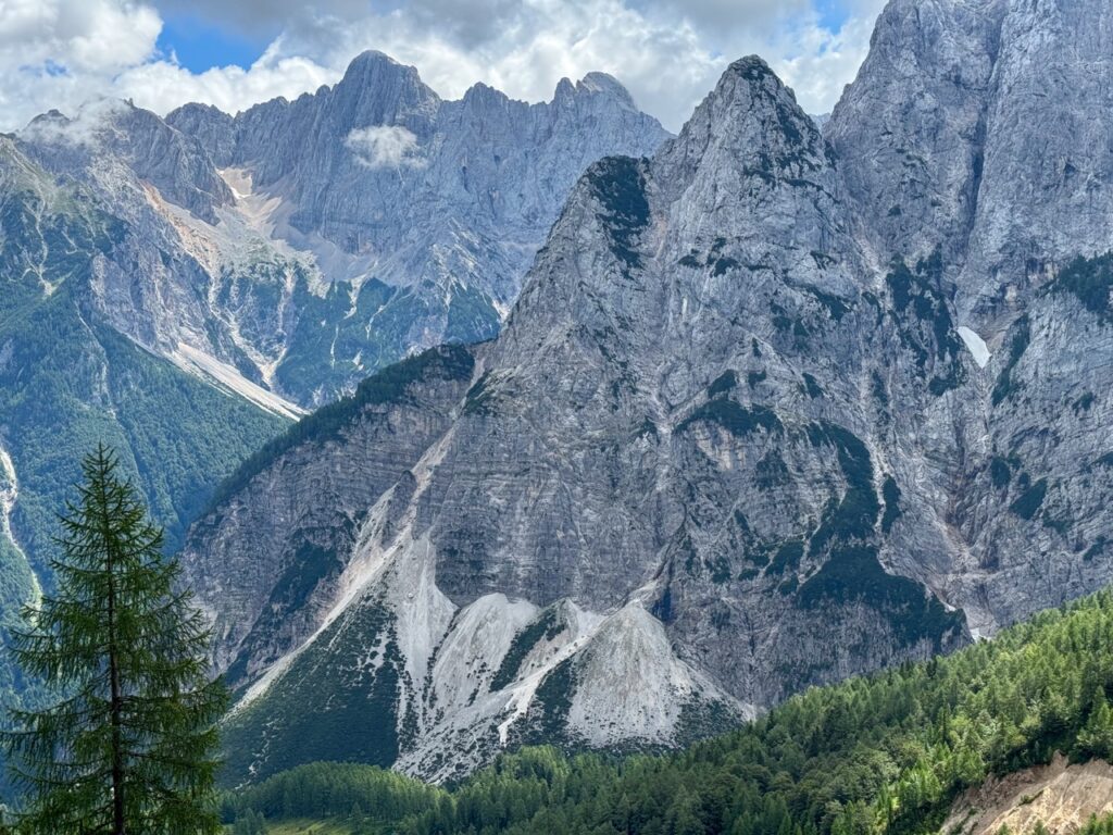Początkowo szlak wiedzie w stronę Mali Mojstrovki, ale po krótkim podejściu odbija w lewo, w kierunku grzbietu. Już od pierwszych kroków czuć wysokość – widoki na przełęcz i otaczające szczyty robią wrażenie. Ścieżka prowadzi lekko w górę i w dół, przez kosodrzewinę. W tle towarzyszy nam monumentalna ściana Prisojnika, a za plecami roztacza się panorama całej przełęczy Vršič. Później z kolei wędrujemy przy ścianie Malej Mojstrovki. Ostatni odcinek prowadzi zakosami na trawiasty szczyt Slemenovej špicy. Na samym wierzchołku jest sporo miejsca, by usiąść, odpocząć i zjeść coś w górskiej scenerii. To także świetne miejsce na zdjęcia – charakterystyczny profil Jalovca wygląda stąd wręcz filmowo.