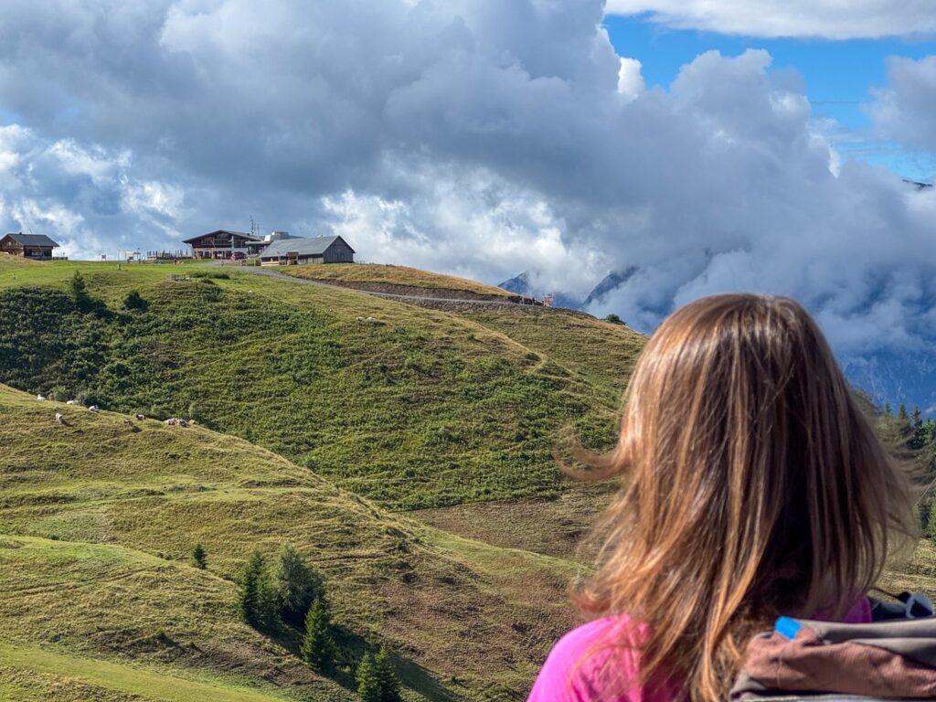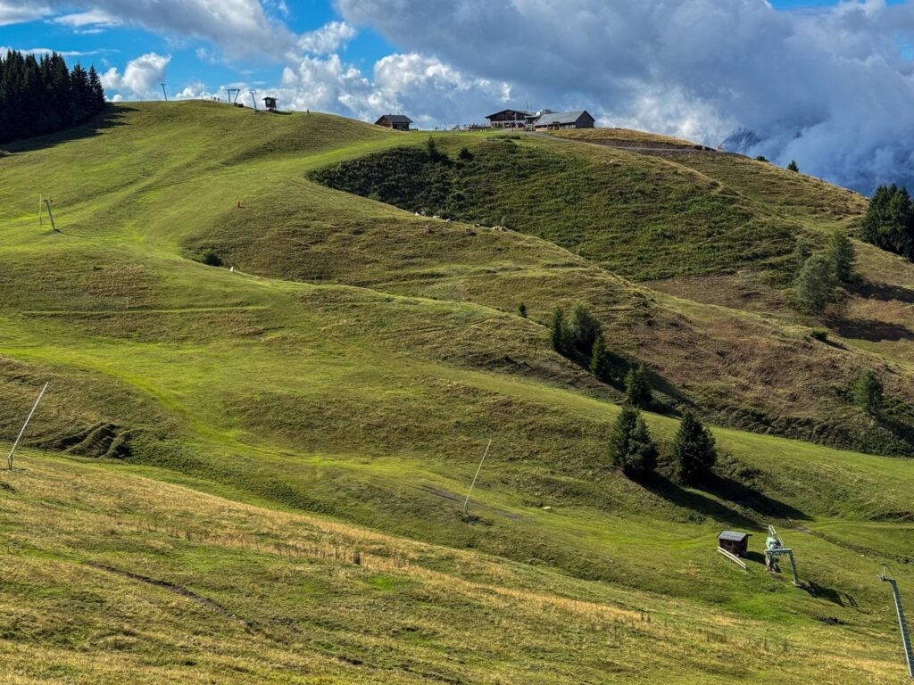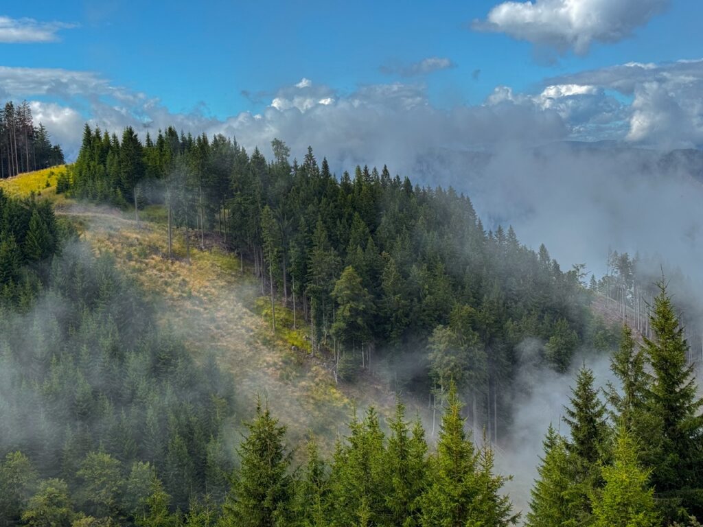 Po pokonaniu kolejnego odcinka wychodzimy na rozległe polany z sielskimi widokami. Pasące się krowy, w oddali konie, górskie widoki i ta cisza skąpana w porannych mgłach! Stąd już niedaleko do Bergrestaurant Dreiländereck, czyli restauracji połączonej z górną stacją kolejki. W niej siądziemy dobie na powrocie, bo mają tu całkiem dobre jedzonko. Teraz wokół jest dość mocno zagospodarowany, ale infrastruktura jest dość ładnie wpisana w otoczenie. Mamy plac zabaw dla dzieci, wodny tor przeszkód, są leżaki i flagi trzech państw (taki charakterytyczny akcent tego miejsca).