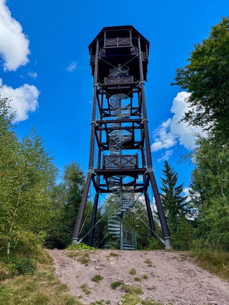 Z Żaltmana do kolejnej wieży mamy około 5 km. Trasa prowadzi obok schroniska, Jastrzębia bouda, ale je zawsze sobie zostawiamy na powrót. Dwukrotnie za to korzystamy z huśtawki znajdującej się jakieś 500 metrów od schroniska. Jest przy szlaku z lewej strony. Ale uwaga! Huśtacie się na własną odpowiedzialność. Można się rozbujać bardzo, a później ciężko zejść z deseczki. I zachowajcie ostrożność, bo tędy wędrują turyści, a i rowerzyści upodobali obie także ten szlak.